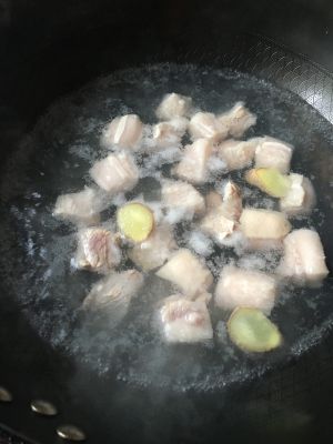 第3步、腌制好的五花肉冷水入锅放入姜片烧至水开沸腾后捞出(大概五分钟左右吧)用温水洗净