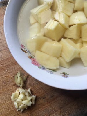 第2步、土豆切块用清水浸泡,大蒜切末,老姜切条