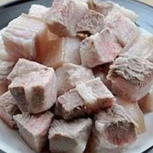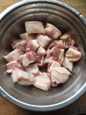 第1步、五花肉洗净切块,用料酒和老姜腌制半小时