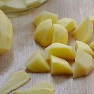 土豆去皮切块,大小随意,新土豆很易熟。姜去皮切片