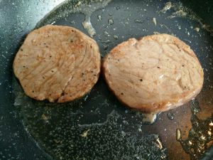 牛排包里有黄油,大火烧热锅,转小火每一面煎一分钟,因为之后还要加在面里炒,所以少煎一会不然会太老。然后用剪刀剪成小块