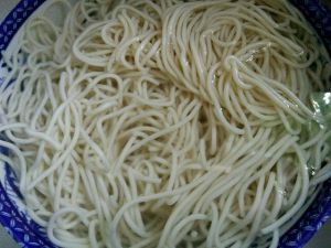 我妈买了不到两斤面,我都煮了,水沸下面,断生就捞出来浸在冷水里。沥干备用(因为我没时间沥干,后期炒出来的面比较粘,最好隔夜就煮好,放在冰箱保鲜里,这样面条就比较滑爽)
