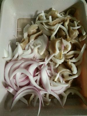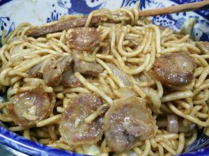 最后加一点点油,把洋葱菌菇先倒进去炒两下,因为洋葱菌菇刚煸炒的时候就有油所以不用倒太多,加面翻炒,加生抽,一点点老抽,少量盐。喜欢吃甜的人就加点糖,我就加了一点点提提味。倒入牛排粒和香肠片,最后放了一点鲜辣粉胡椒粉这个不加也没事。最后加黄瓜条炒匀出锅。