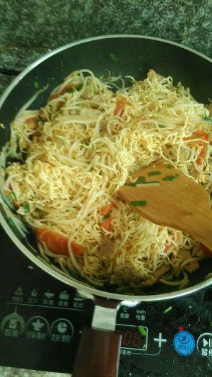 熟了之后加入面条和鸡蛋 继续翻炒 加入味极鲜