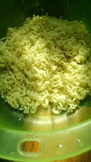 捞出面条沥干放碗里备用,鸡蛋打散。