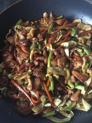 下葱姜蒜末,煸香。下肉炒熟加菜,加蚝油酱油