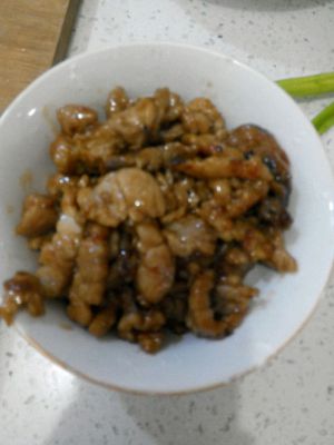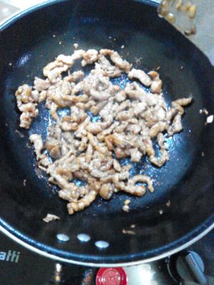 锅烧热,倒入适量油,烧热,放入少量蒜末、葱花炝锅,放入肉丝,爆炒,放入少量酱油烹出酱香味儿