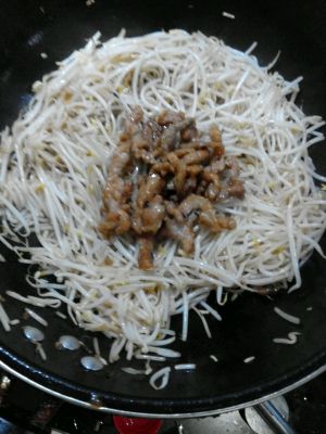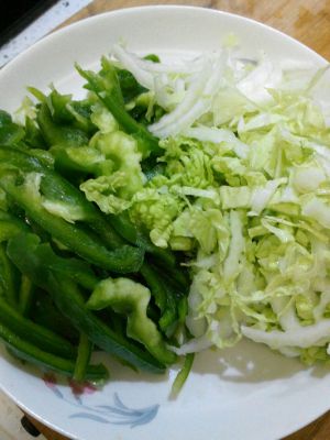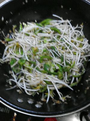 锅里加入适量油,烧热,放入剩下的葱花、蒜末,炝锅。先放青椒丝、嫩白菜丝翻炒,至六成熟时加入绿豆芽,翻炒