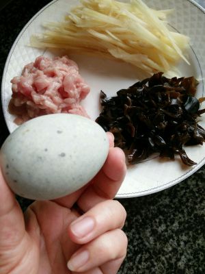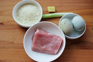 备材料,皮蛋,瘦肉,大米。不好意思,没有来得及拍图片,
