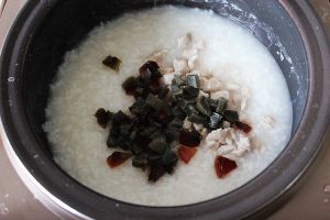 将皮蛋、肉丁、葱姜放入,继续煮一会儿即可