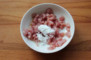 肉切丁,加入料酒、少许盐腌制一会儿,加入干淀粉拌匀