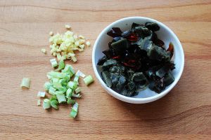 皮蛋捞出后,晾凉切丁,葱姜切末