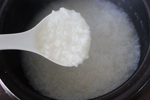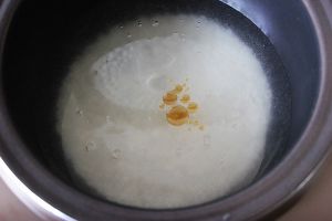 大米煮成底粥,大米提前泡好,开水煮制,滴几滴食用油,提香提色