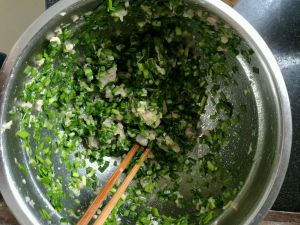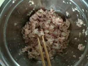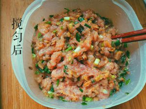 可以适当加一些水,用筷子朝一个方向搅拌馅料。搅拌一会。