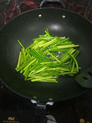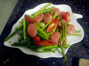 翻炒几下,香肠出现脆皮后,加入蒜苔