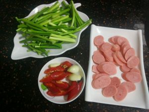 蒜苔切条,香肠切块,蒜切末,都切好后备用
