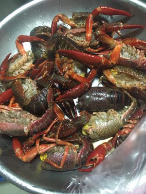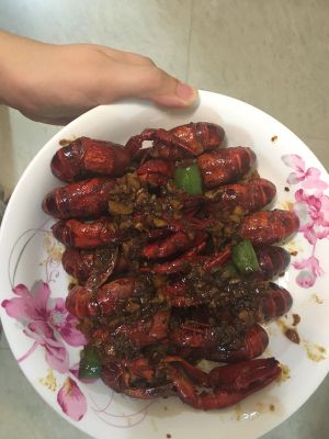 重新起火,用之前的油,加入之前的蒜,姜,葱段,干辣椒,爆香加入生抽2勺,老抽1勺,料酒一点,耗油一勺,老干妈一勺,加入清水煮沸放入之前炸好的龙虾,闷几分钟