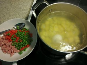 一锅水放盐,先煮熟胡萝卜,然后是青豆,最后把土豆和洗过的鸡蛋一起放进去