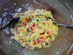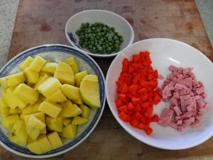 火腿胡萝卜切筷子头大小的丁,花花用的午餐肉,只要是有肉组织口感的都可以,土豆切大块,青豆一把