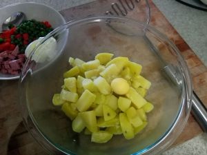 土豆煮到筷子可以戳开,然后捞出来,把蛋黄剥出来,和土豆块一起,要压土豆器压碎,不用太碎,留一些土豆小颗粒会口感更好