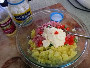 日式土豆色拉比较干,用两个大勺子相互刮就能团成一个色拉球