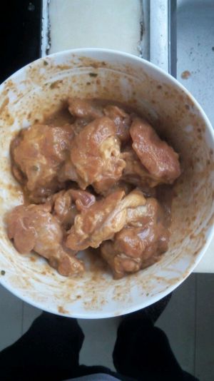 将划刀弄好的鸡翅放入碗或盆中,放入香辣调料粉加入点水,让香辣调料粉成粘稠状态包裹着鸡翅根 放入冰箱保鲜里,大概5小时便可