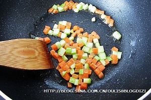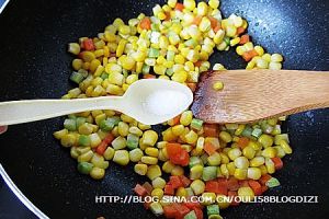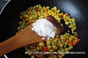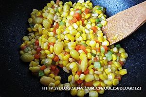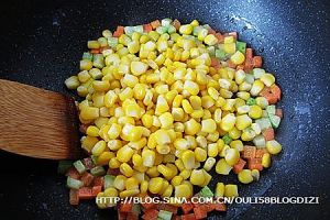 放胡萝卜丁转中火翻炒,至胡萝卜颜色变深,表层出现光泽,放入玉米粒快里翻炒;