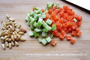 松子放入微波炉中小火一分钟,拿出后稍凉剥去外壳,黄瓜洗净切成小丁,胡萝卜削皮切成小丁;
