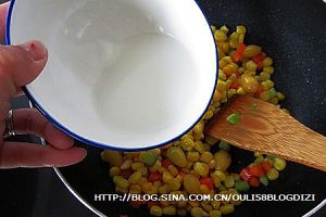 加少量油,放入玉米,黄瓜,胡萝卜,炒熟,加盐和糖