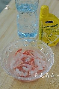 纯净水中加几滴柠檬汁,把剥好的北极虾放入水中,用筷子轻轻顺时针搅拌几圈。