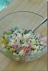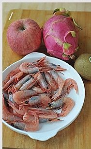 把所有水果去皮去核切小丁,放入一个大碗中,同时放入北极虾仁。