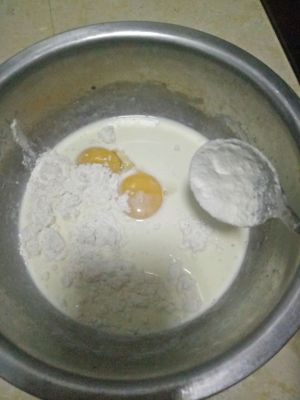 放凉的牛奶中加入鸡蛋和低筋粉搅拌均匀。