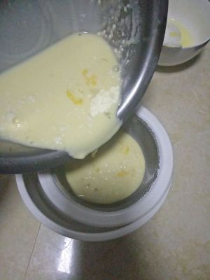 把搅拌均匀的蛋挞水过筛,这一步切勿省略,并且过筛3次最佳