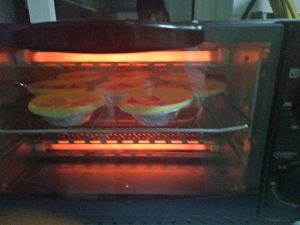 烤箱预热后,把烤盘放进去,上下火190℃/13—15分钟。看芝士有焦斑即熟。挞皮烤制过程中会随温度升高自然变平。