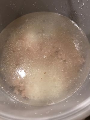 将水倒入剩下的米饭里。要没过米饭。大约半卡左右。放入碱,用电饭锅煮开。