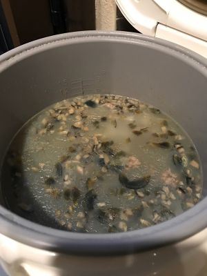 米和纯净水比例1:10。加入皮蛋、瘦肉丝,大火烧开,半小时后转小火,继续煲一个小时。