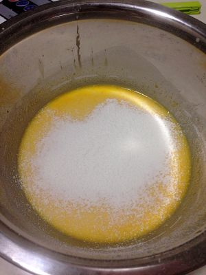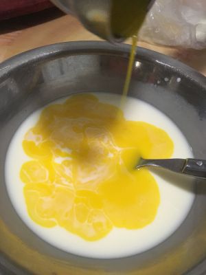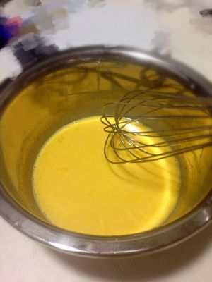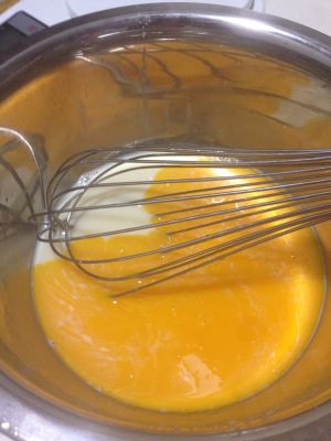 一个鸡蛋黄和一个全蛋 牛奶 白砂糖,炼乳放进碗里一起搅拌均匀