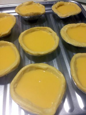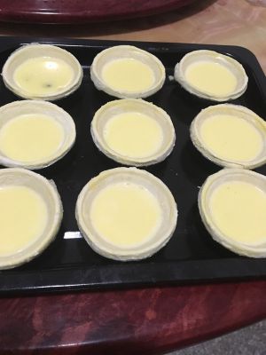蛋挞皮预先从急冻拿出来常温放约15分钟解冻,注入蛋挞液,约八分满。