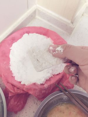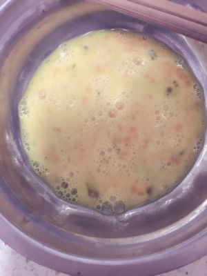 准备鸡蛋液,我用的柴鸡蛋所以是红色的,没放别的。