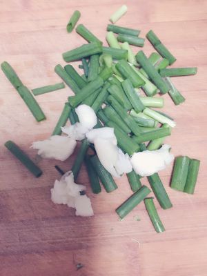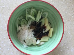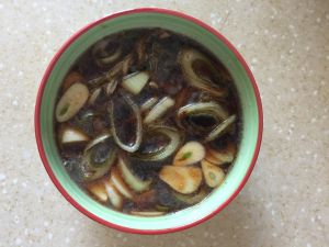 葱切成段,姜切片,蒜切成片,加入老抽,糖,盐,鸡精,加入适量的清水,备用