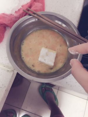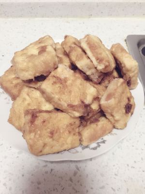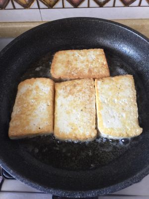 豆腐块先裹上一层淀粉,在裹上一层蛋液放入锅内煎至两面金黄盛出备用。