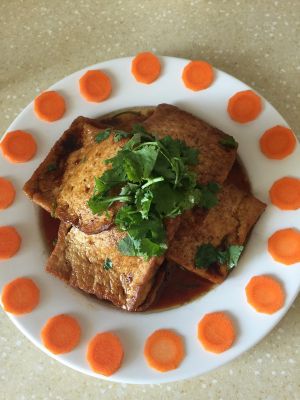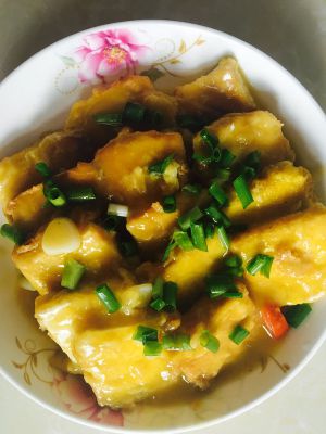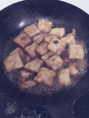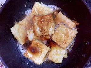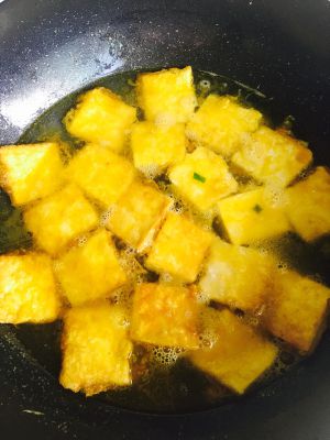 锅中倒入适量的油,倒入调好的汤汁烧开,放入煎好的豆腐,炖至2-3分钟即可出锅,装盘食用了。