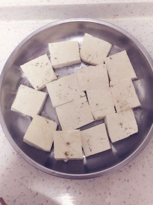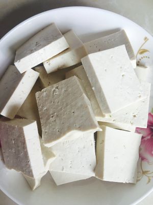准备食材,将豆腐洗净沥干,切成0.6厘米厚、3.3厘米见方的块。