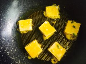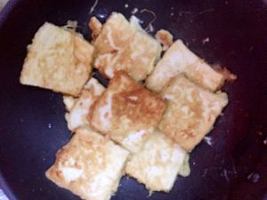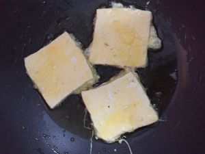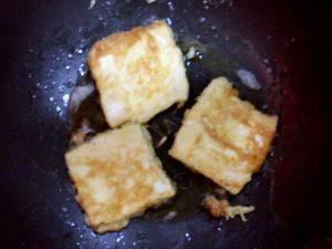 锅内(平底锅最佳)放入油烧热,将豆腐放入小火煎制