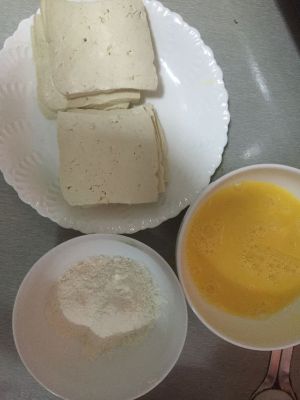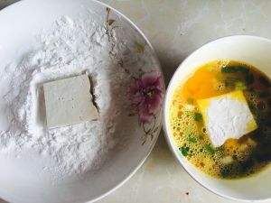 豆腐先放入淀粉,2面沾匀淀粉,再放入蛋液中,2面沾满蛋液