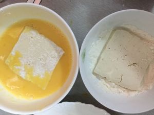 豆腐先沾面粉再裹蛋液下锅炸至两面金黄