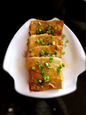 一块豆腐切成薄片,下锅煎成两面金黄捞出备用。