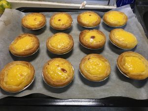 当当当~出炉 烤箱提前预热,200℃,上下火,10min 放入蛋挞,中上层,200℃,15min~17min 这个图是我第一次做的,感觉比第二次的效果好。因为第一次没经验,手忙脚乱的,蛋挞皮解冻时间稍长了一些,第二次有了经验蛋挞皮解冻时间不足30min就进烤箱了,感觉成品效果蛋挞皮起酥效果不如第一次呢