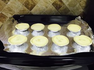 将蛋挞液装进蛋挞里,记住不要太满哦,一般八九分满就可以了