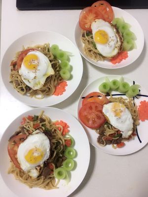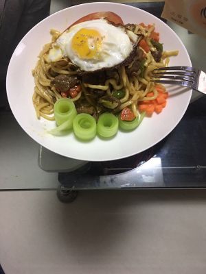 炒锅多放些油,面条容易粘锅,把摆盘剩下的胡萝卜,柿子椒切丝,葱花一起下锅炒,然后放十三香,酱油,之后放炒好的牛肉,一起炒,放适量盐,最后放面条!再放一点耗油,炒匀关火!